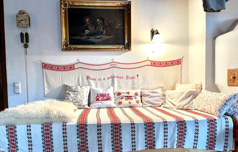 Der Wohnraum mit Küche, Kachelofen, netter Essecke und offenem Kamin ist ausgesprochen gemütlich und behaglich.