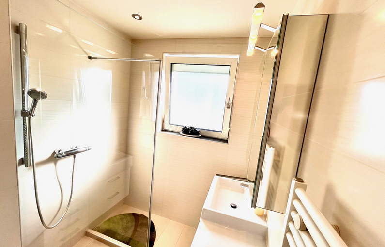 Das WC und das Badezimmer (mit Fenster) sind voneinander getrennt und mit hochwertigen Glastüren ausgestattet.